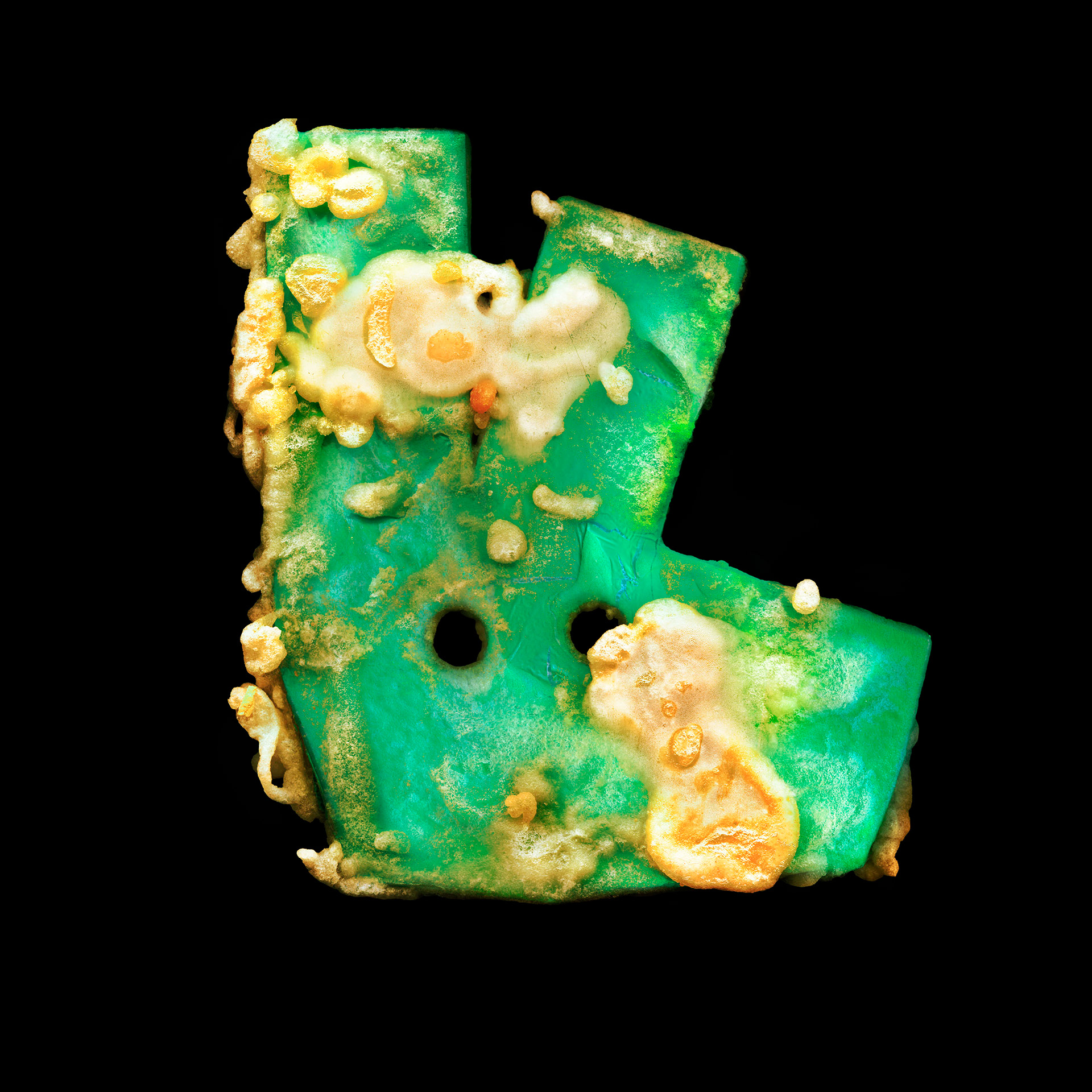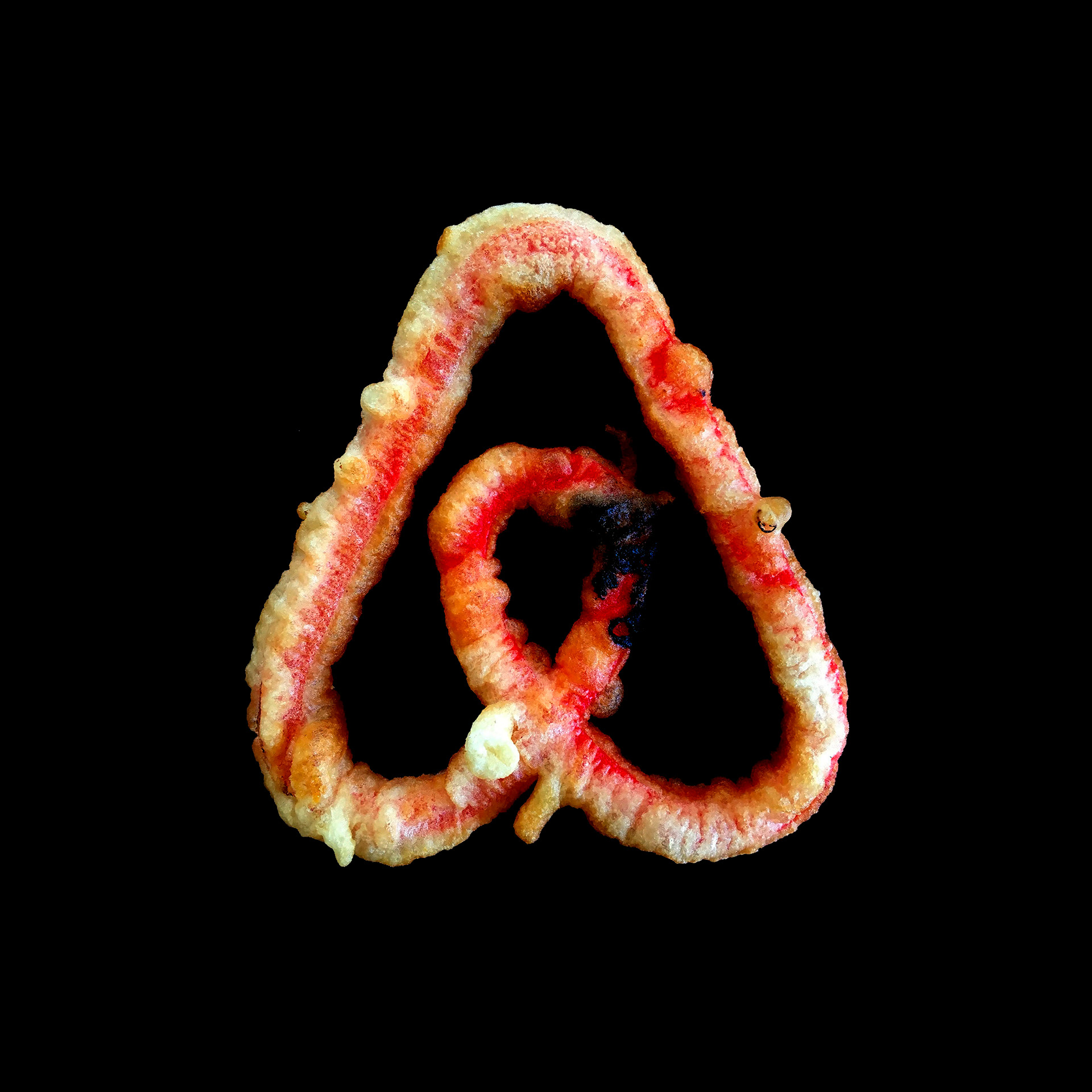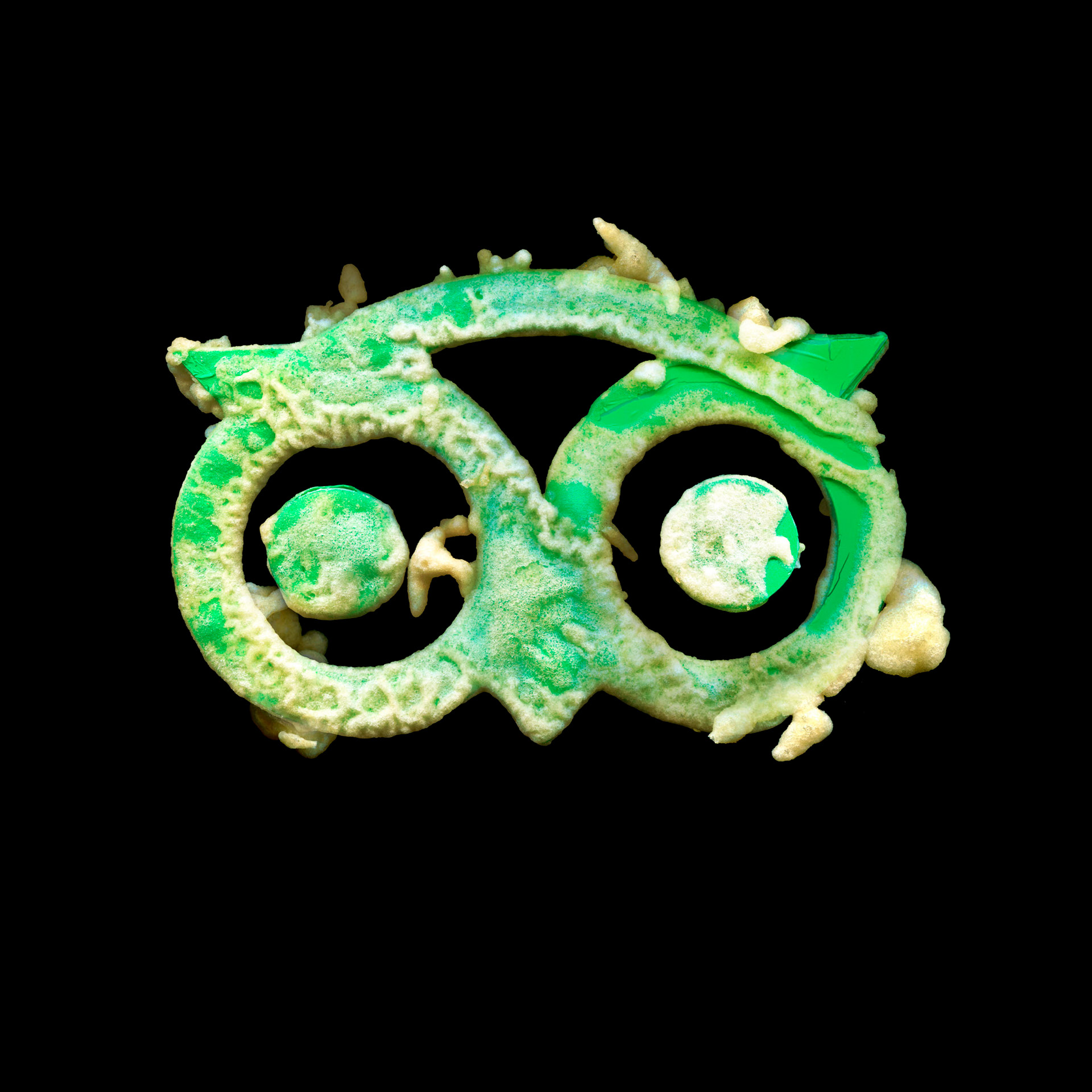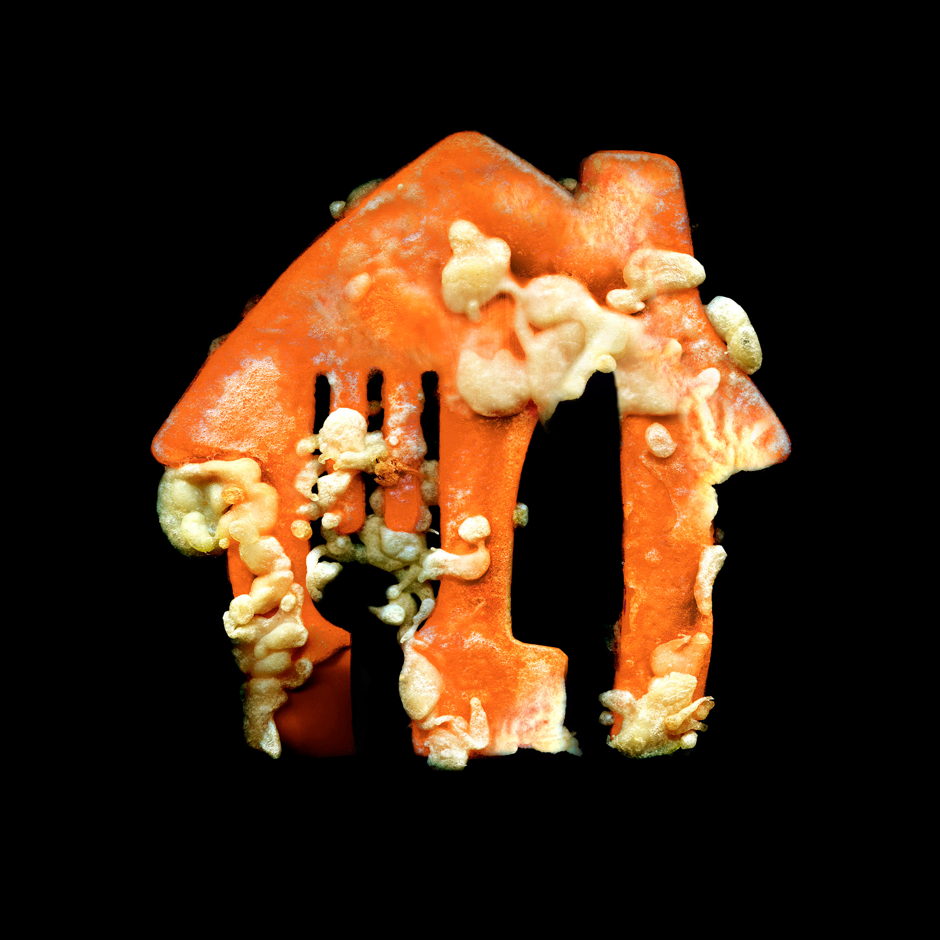 Big Fries explores the tension between the immateriality of data and the violence of matter. Through 3D printing and subsequent deep-frying, symbols of companies operating on digital flows are dragged into an organic dimension, making the algorithm tangible through thermal stress. The fried object is then scanned in high definition and presented as a print on a black background.